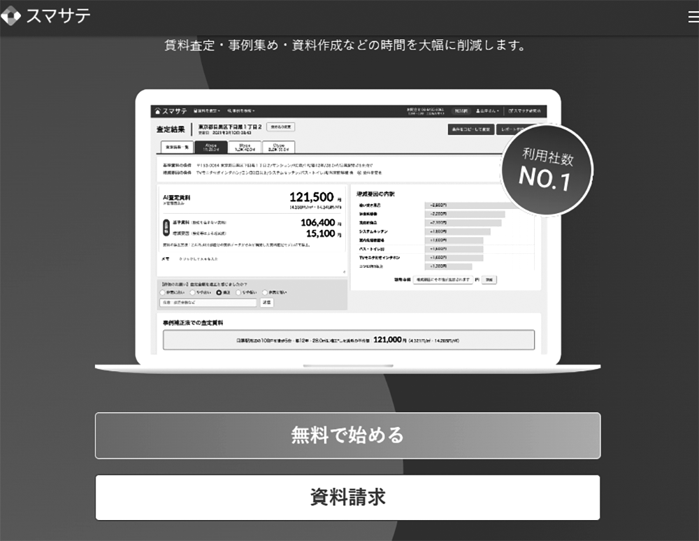 以上が査定の流れです。家賃査定サイトのおススメは「スマサテ」です。オーナー様が直接利用でき、サイトで条件を入力すれば、競合物件や適正賃料が把握できます。