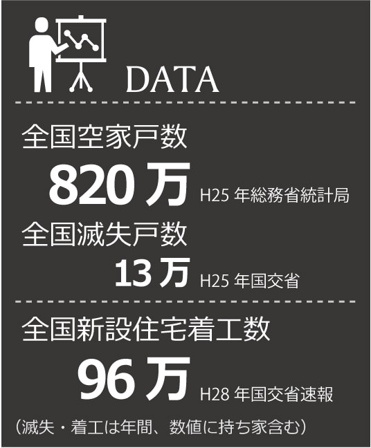 慢性的に部屋が余っている状態が続いています。新聞やTVでも報じられている通り、全国の空き家戸数が平成5年当時では448万戸が、およそ20年間で1.8倍の820万戸、空家率で同じく20年間で3.7%上昇の13.5%となり現在も上昇を続けています。それでも新築住宅着工数は前年比6%増の、96万戸と勢いを見せ、部屋が余るという問題を刺激しています。